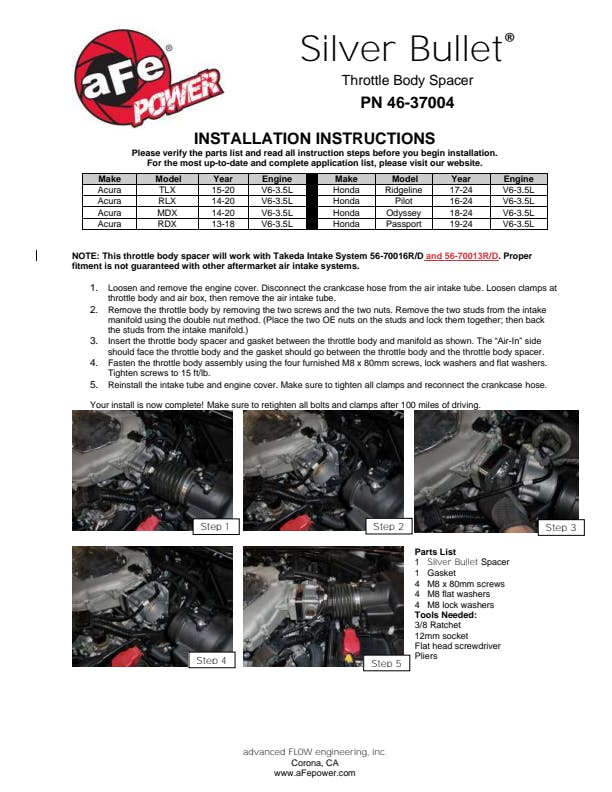 Silver Bullet Throttle Body Spacer Kit Acura MDX/RDX/RLX/TLX 13-20/Honda Ridgeline 17-25 V6-3.5L