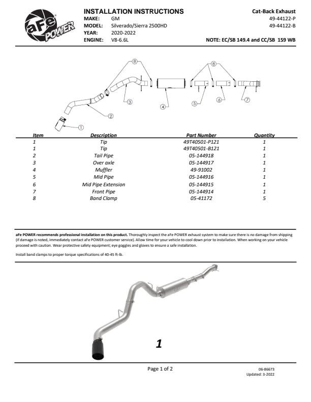 This cat-back exhaust system is constructed of 4" mandrel-bent 409 stainless steel tubing for maximum strength and durability. This system features a high-flow 409 stainless steel muffler, producing a deep sound. Finishing off this exhaust system is a 5" diameter polished 409 stainless steel intercooled clamp-on exhaust tip. The tip features an aFe POWER logo plate riveted on for a unique style. This system produces a deep sound unleashing all available horsepower and torque. Utilizing a factory style flange and hangers this system is a direct bolt-on system, which requires no cutting or modifications for a hassle-free installation. Utilizing state-of-the-art computer-aided design technology, this exhaust system is designed for custom, high tolerance factory fitment. 100% MIG-Welded for race-proven strength and durability.