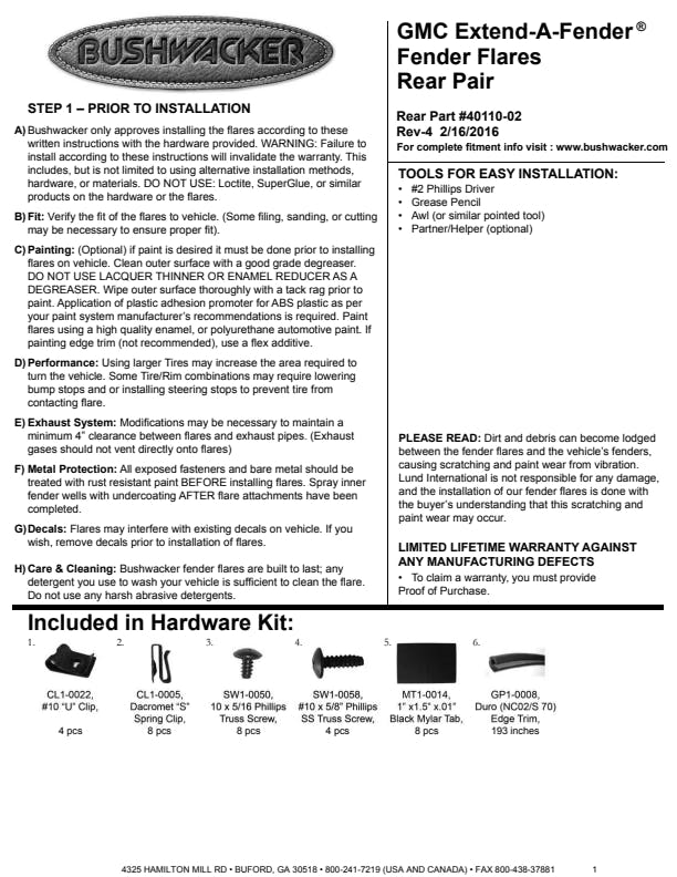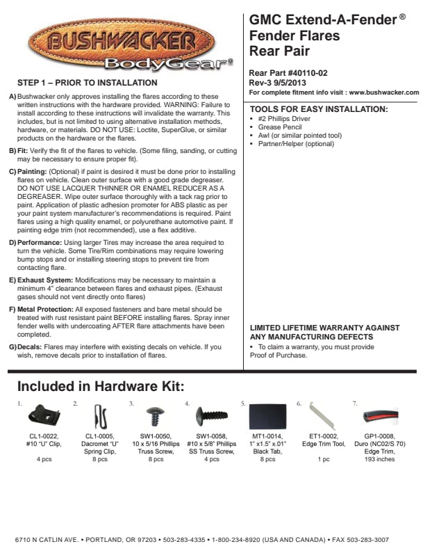 You've equipped your vehicle with oversize wheels and tires for serious off-road traction and clearance. Now you need extra tire coverage to protect your rig's body and maybe even comply with local laws. Bushwacker Extend-A-Fender Flares deliver premium-grade protection and style matched to oversized tires, yet as tough as they are, they go on easily with no drilling required. You can install them in minutes and enjoy them for years. Our exclusive Dura-Flex 2000 material is designed for added durability and flexibility with built-in UV protection. Your Extend-A-Fender Flares resist chalking, cracking, and warping, whether you leave them with their OEM-style matte black finish or paint them for a totally personalized look. Either way, your truck will look factory-equipped for your off-road tires. Extend-A-Fender Flares go on easy, perform tough, and look great.