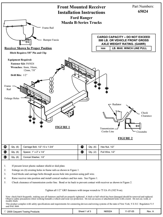 Draw-Tite Front Mount Receivers are built according to manufacturer vehicle specifications and model year to ensure a perfect fit and top towing performance. Featuring solid all-welded construction for maximum strength and safety, every hitch meets and exceeds industry standards. 2" Square Receiver Tube Opening Offers a secure and useful attachment pointNeat Appearance, All Frame Attachments E-Coat Base w/ Black Powder Coat Finish Rated up to 9,000 lbs. Line PullRated up to 500 lbs. Tongue Weight Solid All-Welded Construction for Maximum Strength and Safety Custom Built According to Manufacturer & Model Year Computer-Aided Design and Fatigue Stress Testing Designed to Withstand Road Abuse Within Specified Capacities Backed by a Nationwide Limited Lifetime Warranty