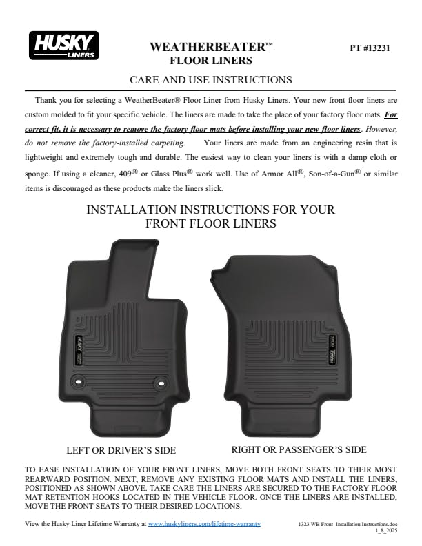Expand the Husky Liner protection you love from bumper to bumper, with Weatherbeater? Cargo Liners. These all-weather, any-conditions liners are ready for anything you throw in the back and stand up to even the toughest spills. Husky?s rubberized DuraGrip? surface and ProGard? formula keep cargo protected with durable flexibility, and no shifting around. Installs in minutes and stays in place until you?re ready to take out and clean. Available in black, gray, or tan for a factory look to match your vehicle?s interior. Backed by Husky Liners Guaranteed for Life. Proudly made in the U.S.A.